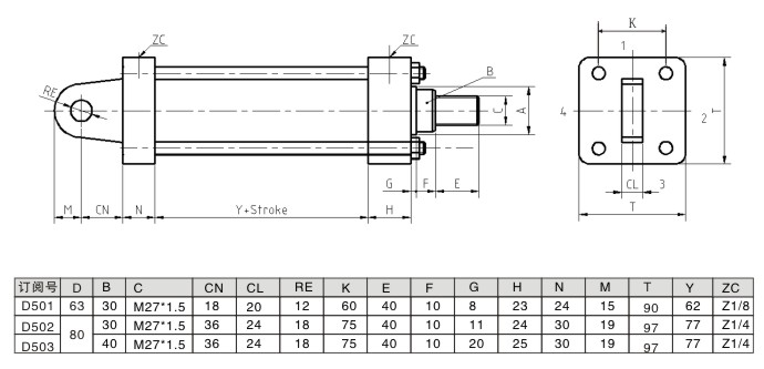 銷孔安裝的低壓拉桿液壓缸的尺寸圖及參數(shù)