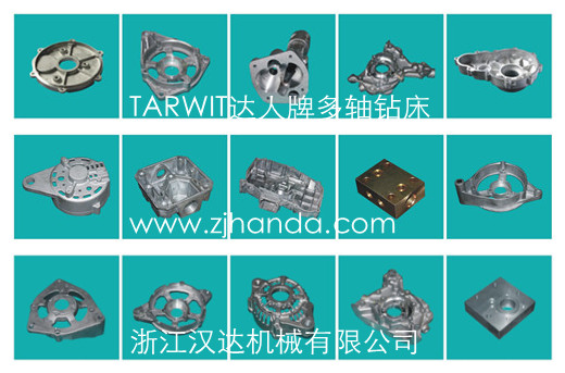 該產(chǎn)品可廣泛應(yīng)用于機(jī)械行業(yè)多孔零部件的鉆孔及攻絲加工,如汽車(chē)、摩托車(chē)多孔零部件、發(fā)動(dòng)機(jī)箱體、鋁鑄件殼體、制動(dòng)鼓、剎車(chē)盤(pán)、轉(zhuǎn)向器、輪轂、差速殼、軸頭、半軸等,泵類(lèi)、閥類(lèi)、液壓元件、太陽(yáng)能配件等等。比如以下工件: